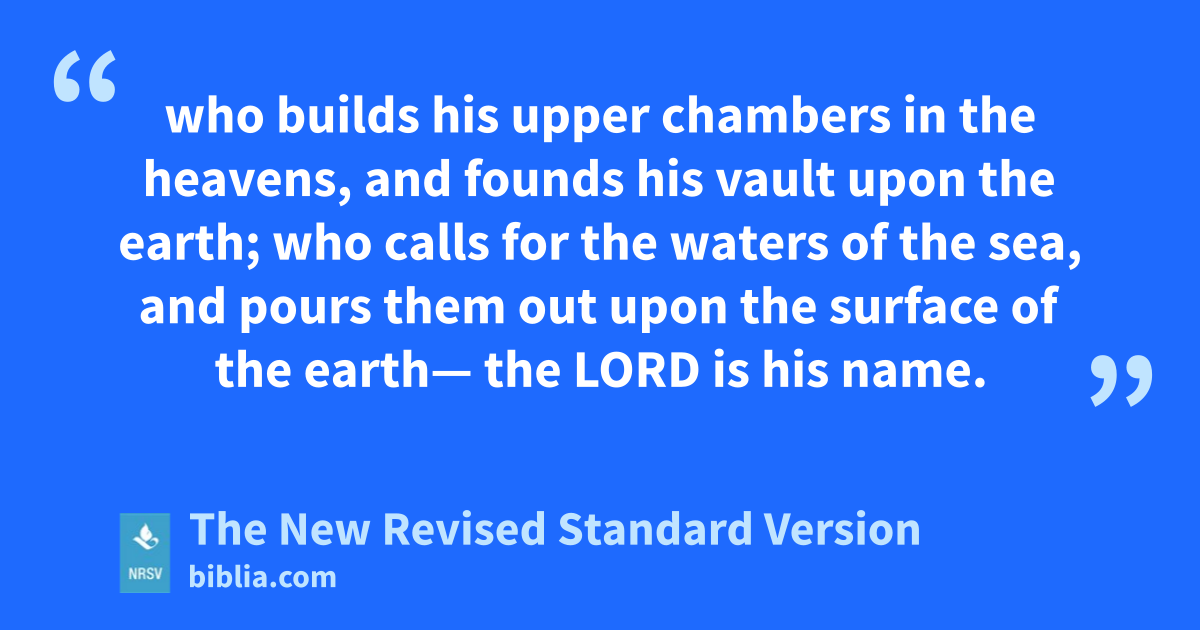 who builds his upper chambers in the heavens, and founds his vault upon the earth; who calls for the waters of the sea, and pours them out upon the surface of the earth— the LORD is his name.