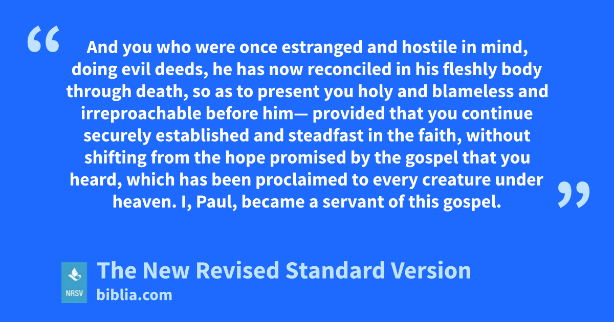 And you who were once estranged and hostile in mind, doing evil deeds, he has now reconciled in his fleshly body through death, so as to present you holy and blameless and irreproachable before him— provided that you continue securely established and steadfast in the faith, without shifting from the hope promised by the gospel that you heard, which has been proclaimed to every creature under heaven. I, Paul, became a servant of this gospel.