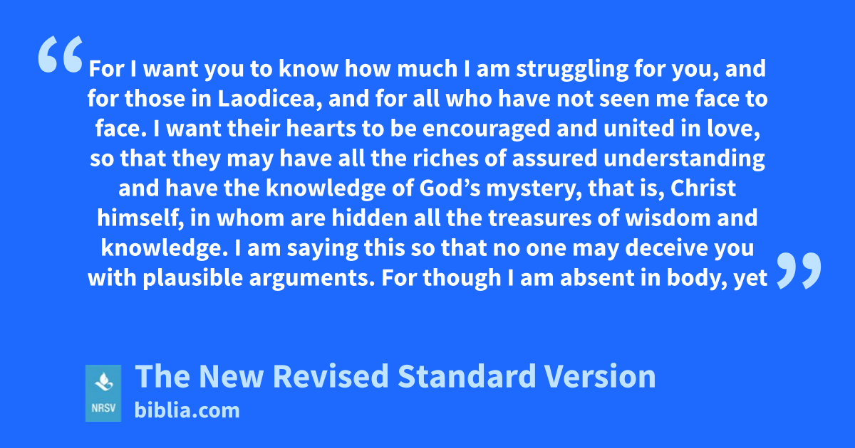 For I want you to know how much I am struggling for you, and for those in Laodicea, and for all who have not seen me face to face. I want their hearts to be encouraged and united in love, so that they may have all the riches of assured understanding and have the knowledge of God’s mystery, that is, Christ himself, in whom are hidden all the treasures of wisdom and knowledge. I am saying this so that no one may deceive you with plausible arguments. For though I am absent in body, yet