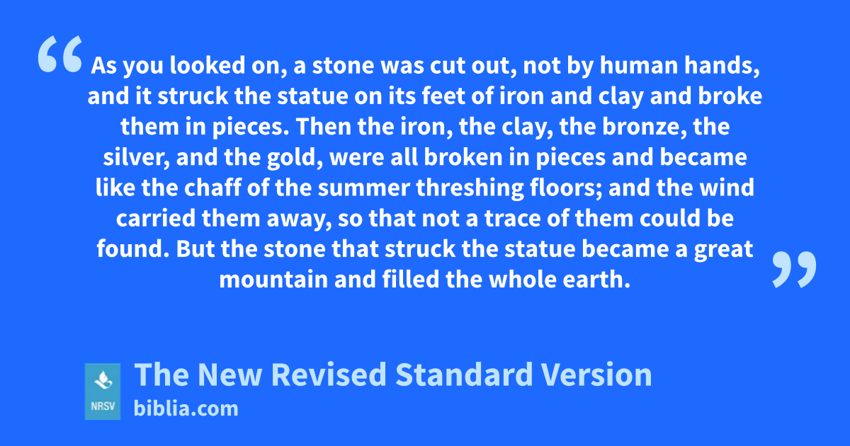 As you looked on, a stone was cut out, not by human hands, and it struck the statue on its feet of iron and clay and broke them in pieces. Then the iron, the clay, the bronze, the silver, and the gold, were all broken in pieces and became like the chaff of the summer threshing floors; and the wind carried them away, so that not a trace of them could be found. But the stone that struck the statue became a great mountain and filled the whole earth.