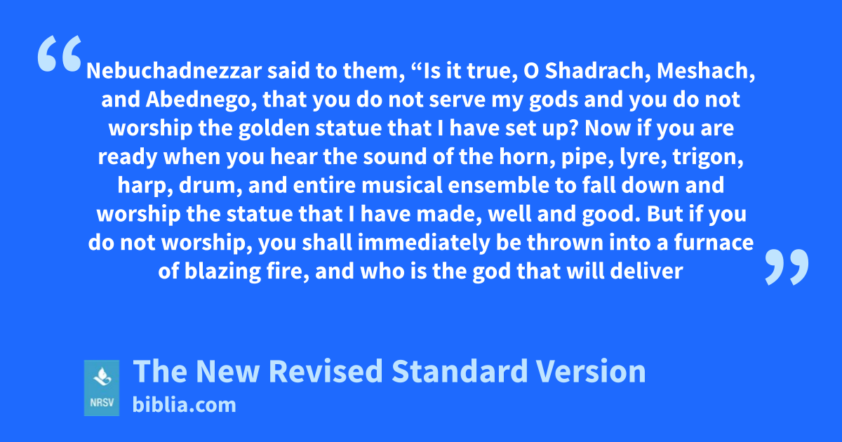 Nebuchadnezzar said to them, “Is it true, O Shadrach, Meshach, and Abednego, that you do not serve my gods and you do not worship the golden statue that I have set up? Now if you are ready when you hear the sound of the horn, pipe, lyre, trigon, harp, drum, and entire musical ensemble to fall down and worship the statue that I have made, well and good. But if you do not worship, you shall immediately be thrown into a furnace of blazing fire, and who is the god that will deliver