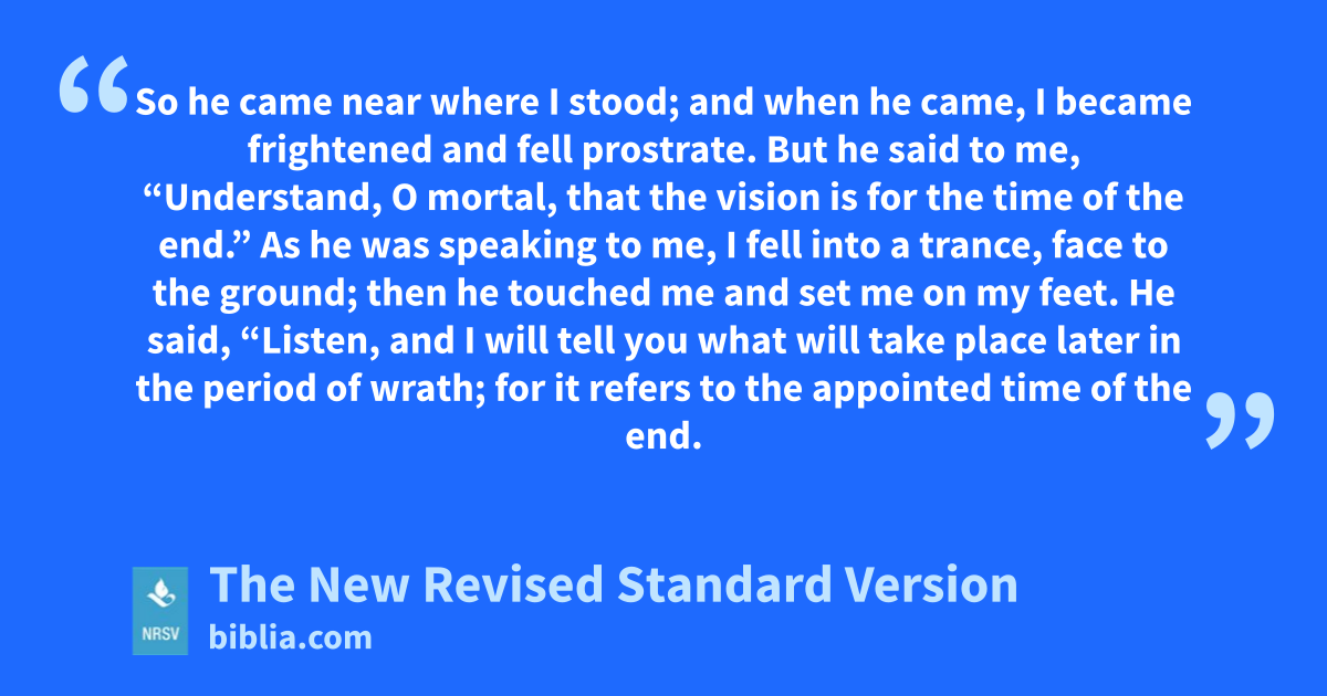 So he came near where I stood; and when he came, I became frightened and fell prostrate. But he said to me, “Understand, O mortal, that the vision is for the time of the end.” As he was speaking to me, I fell into a trance, face to the ground; then he touched me and set me on my feet. He said, “Listen, and I will tell you what will take place later in the period of wrath; for it refers to the appointed time of the end.