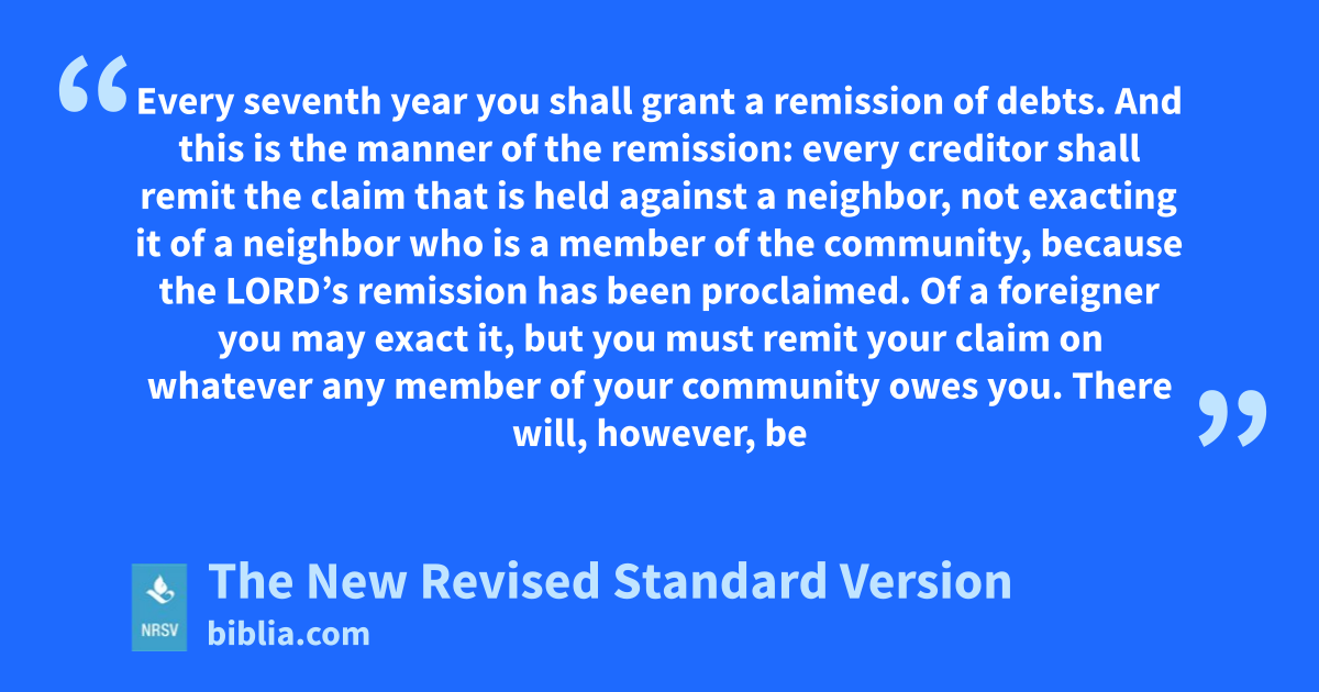 Every seventh year you shall grant a remission of debts. And this is the manner of the remission: every creditor shall remit the claim that is held against a neighbor, not exacting it of a neighbor who is a member of the community, because the LORD’s remission has been proclaimed. Of a foreigner you may exact it, but you must remit your claim on whatever any member of your community owes you. There will, however, be
