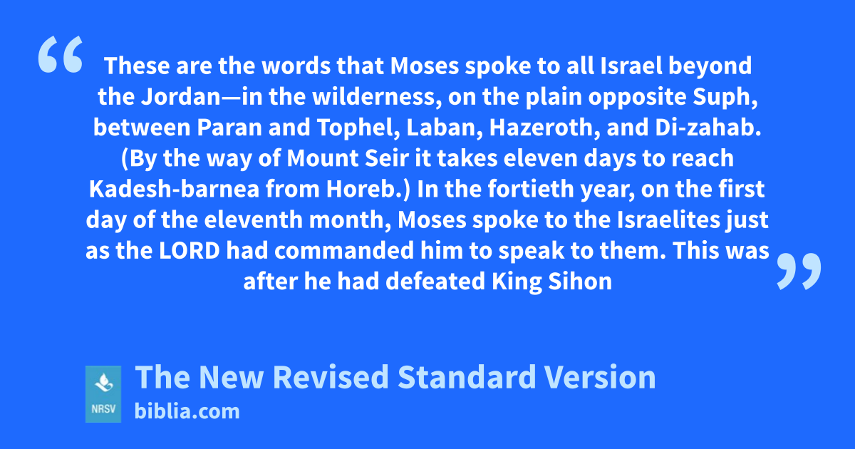 These are the words that Moses spoke to all Israel beyond the Jordan—in the wilderness, on the plain opposite Suph, between Paran and Tophel, Laban, Hazeroth, and Di-zahab. (By the way of Mount Seir it takes eleven days to reach Kadesh-barnea from Horeb.) In the fortieth year, on the first day of the eleventh month, Moses spoke to the Israelites just as the LORD had commanded him to speak to them. This was after he had defeated King Sihon