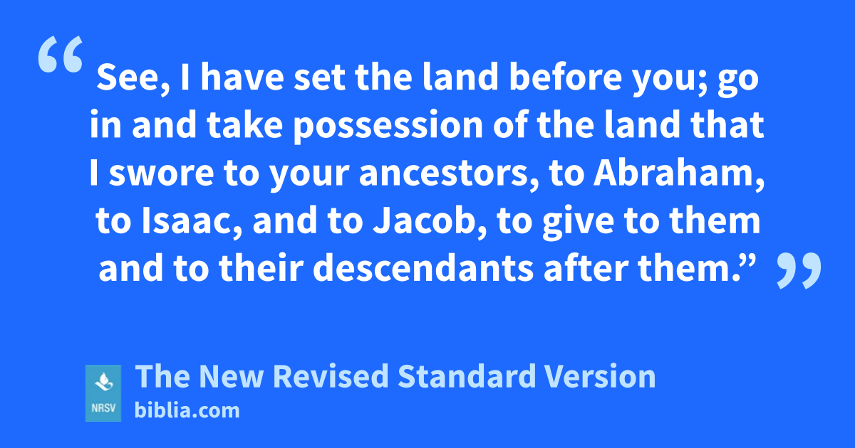 See, I have set the land before you; go in and take possession of the land that I swore to your ancestors, to Abraham, to Isaac, and to Jacob, to give to them and to their descendants after them.”