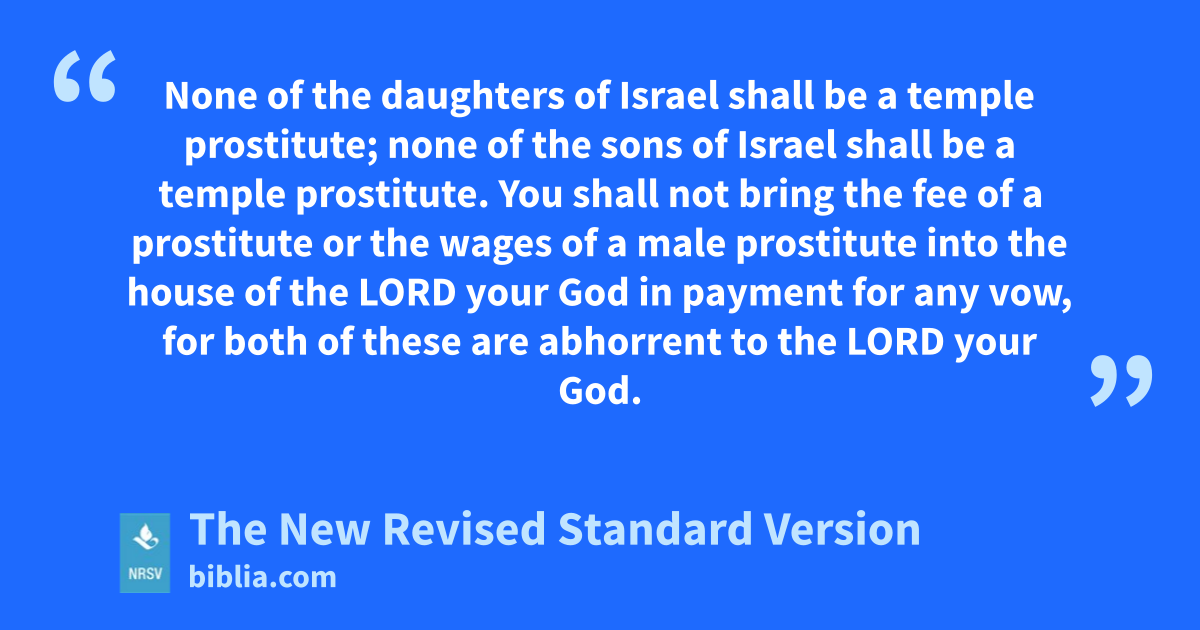 None of the daughters of Israel shall be a temple prostitute; none of the sons of Israel shall be a temple prostitute. You shall not bring the fee of a prostitute or the wages of a male prostitute into the house of the LORD your God in payment for any vow, for both of these are abhorrent to the LORD your God.