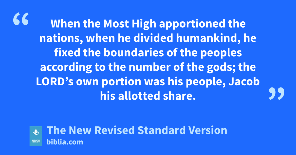 When the Most High apportioned the nations, when he divided humankind, he fixed the boundaries of the peoples according to the number of the gods; the LORD’s own portion was his people, Jacob his allotted share.