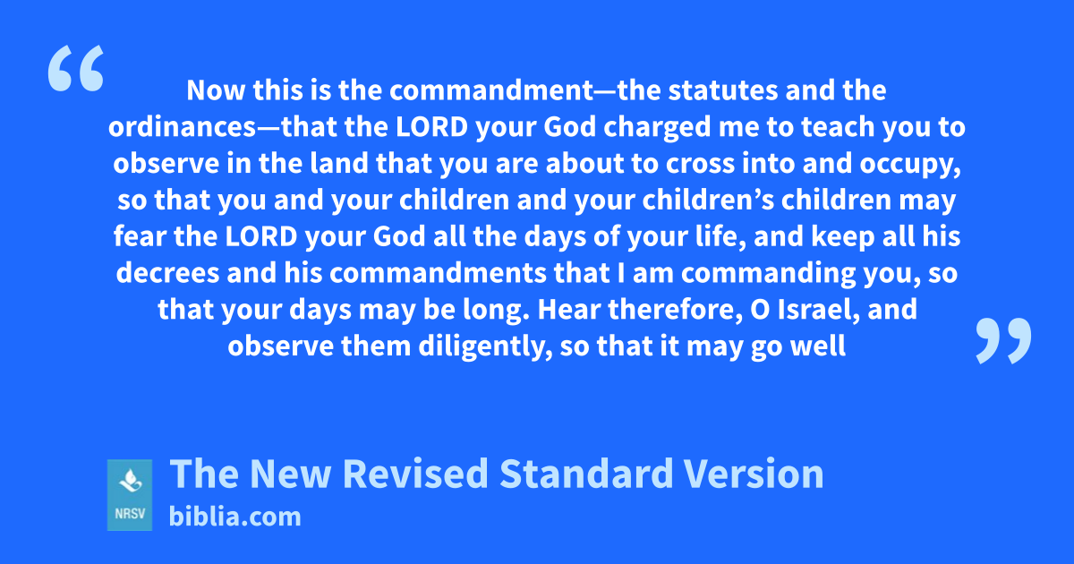 Now this is the commandment—the statutes and the ordinances—that the LORD your God charged me to teach you to observe in the land that you are about to cross into and occupy, so that you and your children and your children’s children may fear the LORD your God all the days of your life, and keep all his decrees and his commandments that I am commanding you, so that your days may be long. Hear therefore, O Israel, and observe them diligently, so that it may go well