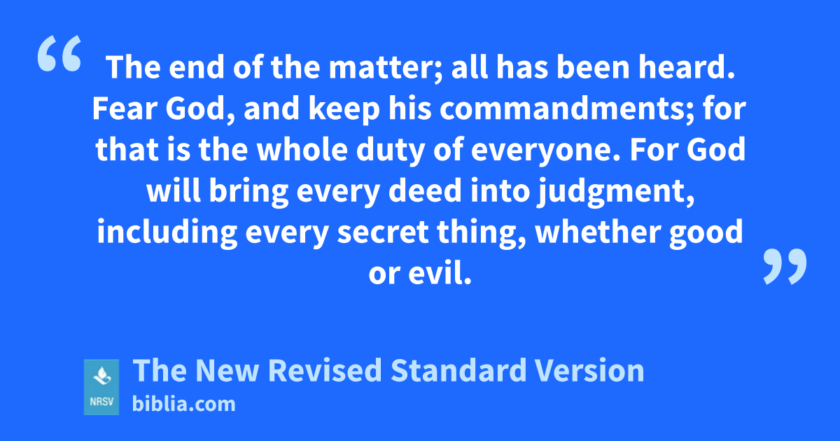 The end of the matter; all has been heard. Fear God, and keep his commandments; for that is the whole duty of everyone. For God will bring every deed into judgment, including every secret thing, whether good or evil.