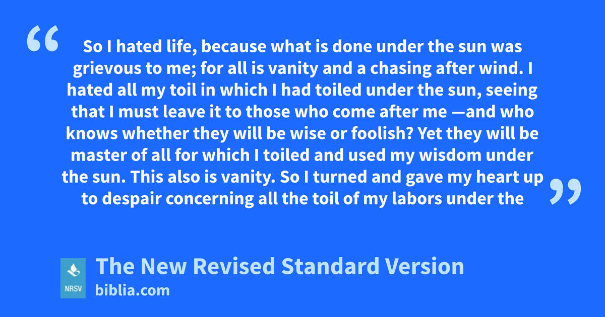 So I hated life, because what is done under the sun was grievous to me; for all is vanity and a chasing after wind. I hated all my toil in which I had toiled under the sun, seeing that I must leave it to those who come after me —and who knows whether they will be wise or foolish? Yet they will be master of all for which I toiled and used my wisdom under the sun. This also is vanity. So I turned and gave my heart up to despair concerning all the toil of my labors under the