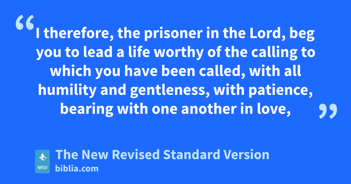 I therefore, the prisoner in the Lord, beg you to lead a life worthy of the calling to which you have been called, with all humility and gentleness, with patience, bearing with one another in love,