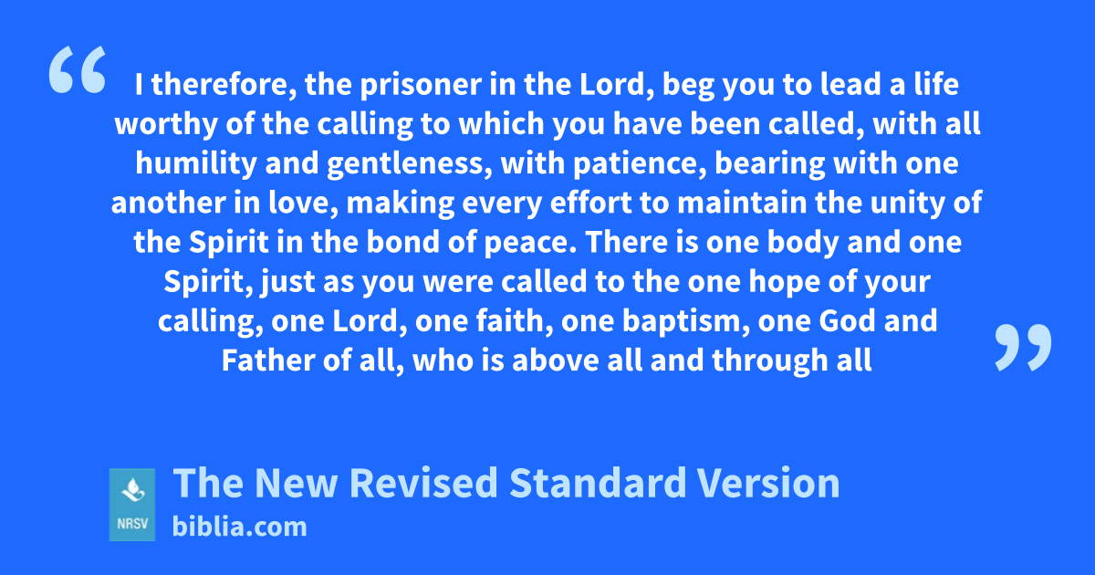 I therefore, the prisoner in the Lord, beg you to lead a life worthy of the calling to which you have been called, with all humility and gentleness, with patience, bearing with one another in love, making every effort to maintain the unity of the Spirit in the bond of peace. There is one body and one Spirit, just as you were called to the one hope of your calling, one Lord, one faith, one baptism, one God and Father of all, who is above all and through all