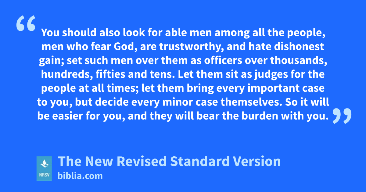 You should also look for able men among all the people, men who fear God, are trustworthy, and hate dishonest gain; set such men over them as officers over thousands, hundreds, fifties and tens. Let them sit as judges for the people at all times; let them bring every important case to you, but decide every minor case themselves. So it will be easier for you, and they will bear the burden with you.
