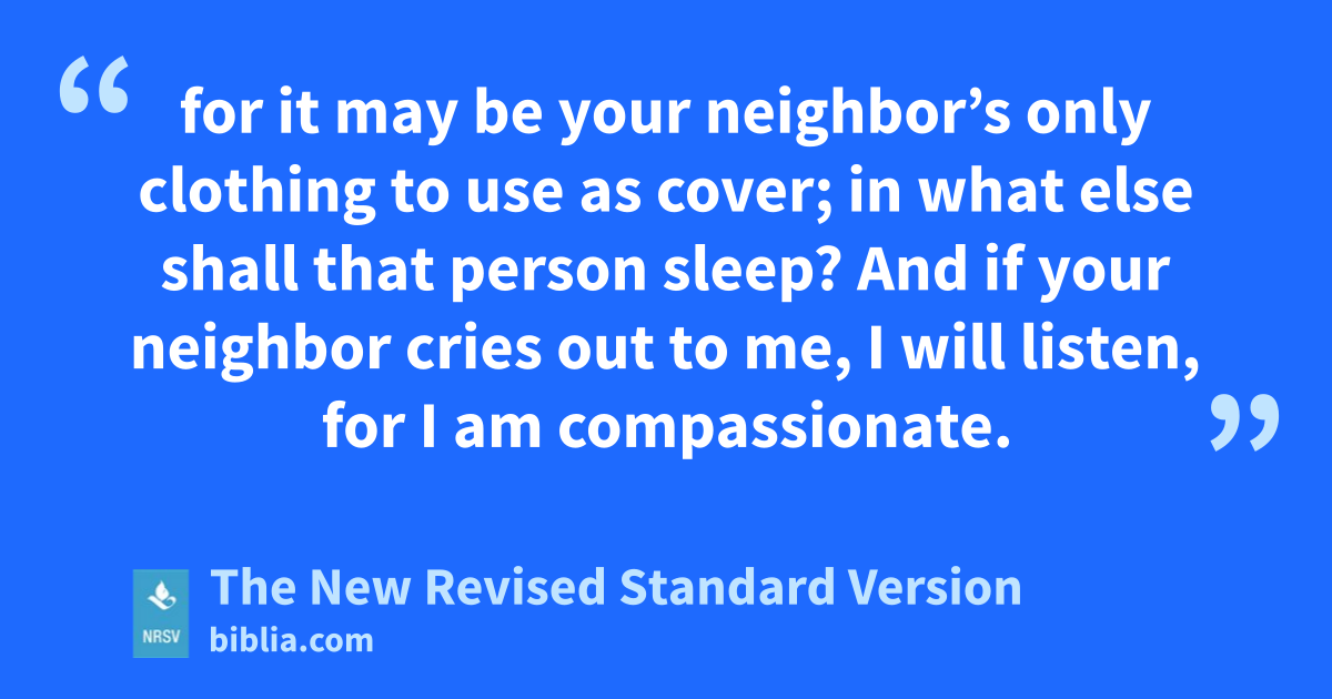 for it may be your neighbor’s only clothing to use as cover; in what else shall that person sleep? And if your neighbor cries out to me, I will listen, for I am compassionate.