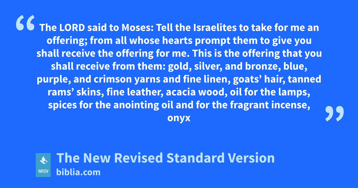 The LORD said to Moses: Tell the Israelites to take for me an offering; from all whose hearts prompt them to give you shall receive the offering for me. This is the offering that you shall receive from them: gold, silver, and bronze, blue, purple, and crimson yarns and fine linen, goats’ hair, tanned rams’ skins, fine leather, acacia wood, oil for the lamps, spices for the anointing oil and for the fragrant incense, onyx