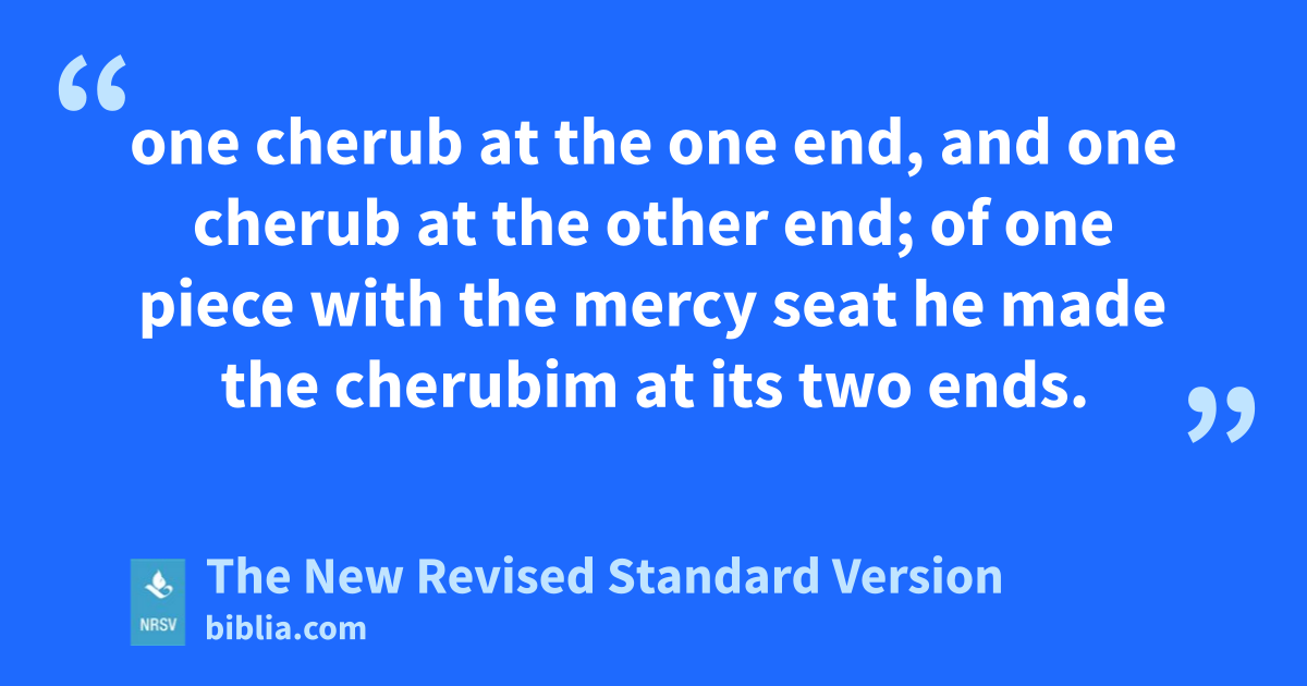 one cherub at the one end, and one cherub at the other end; of one piece with the mercy seat he made the cherubim at its two ends.