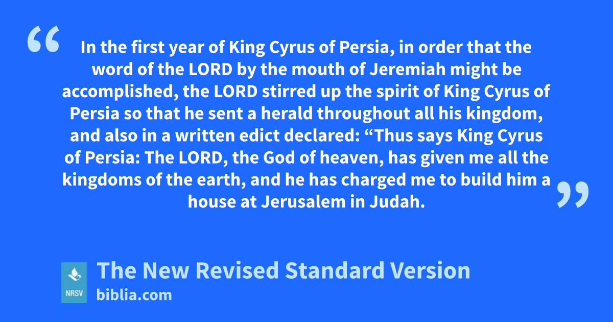 In the first year of King Cyrus of Persia, in order that the word of the LORD by the mouth of Jeremiah might be accomplished, the LORD stirred up the spirit of King Cyrus of Persia so that he sent a herald throughout all his kingdom, and also in a written edict declared: “Thus says King Cyrus of Persia: The LORD, the God of heaven, has given me all the kingdoms of the earth, and he has charged me to build him a house at Jerusalem in Judah.