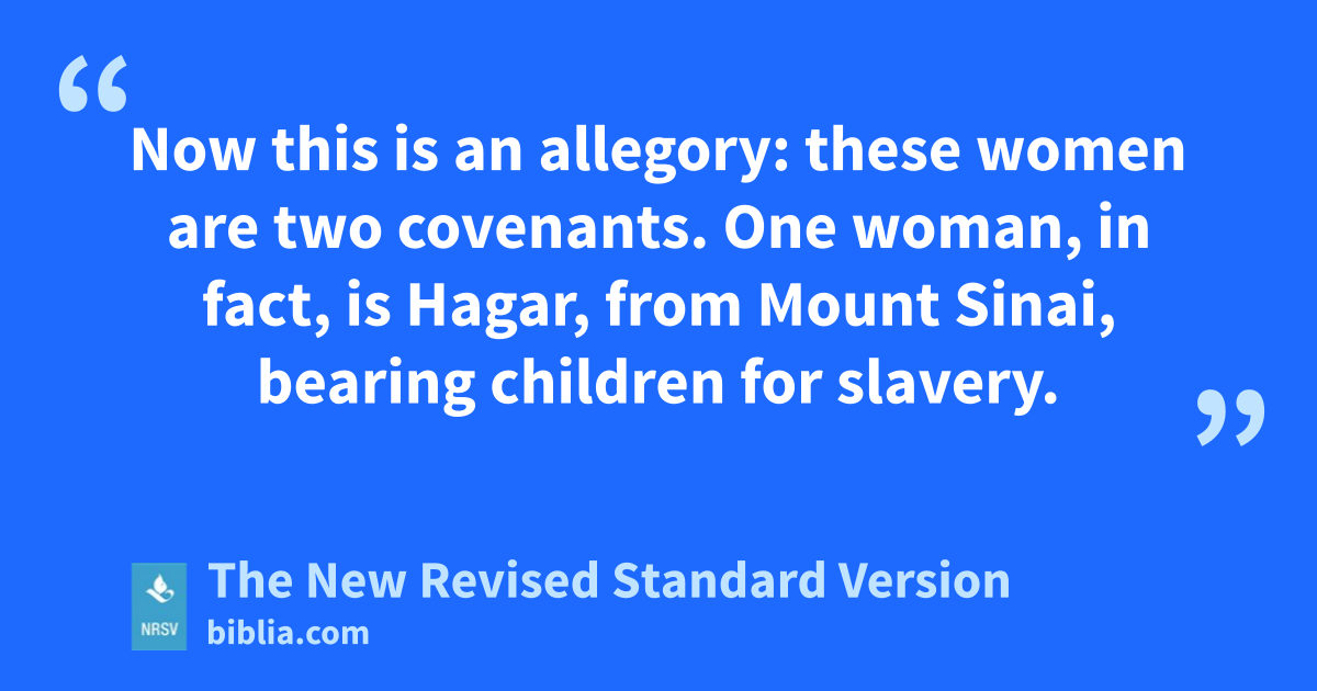 Now this is an allegory: these women are two covenants. One woman, in fact, is Hagar, from Mount Sinai, bearing children for slavery.