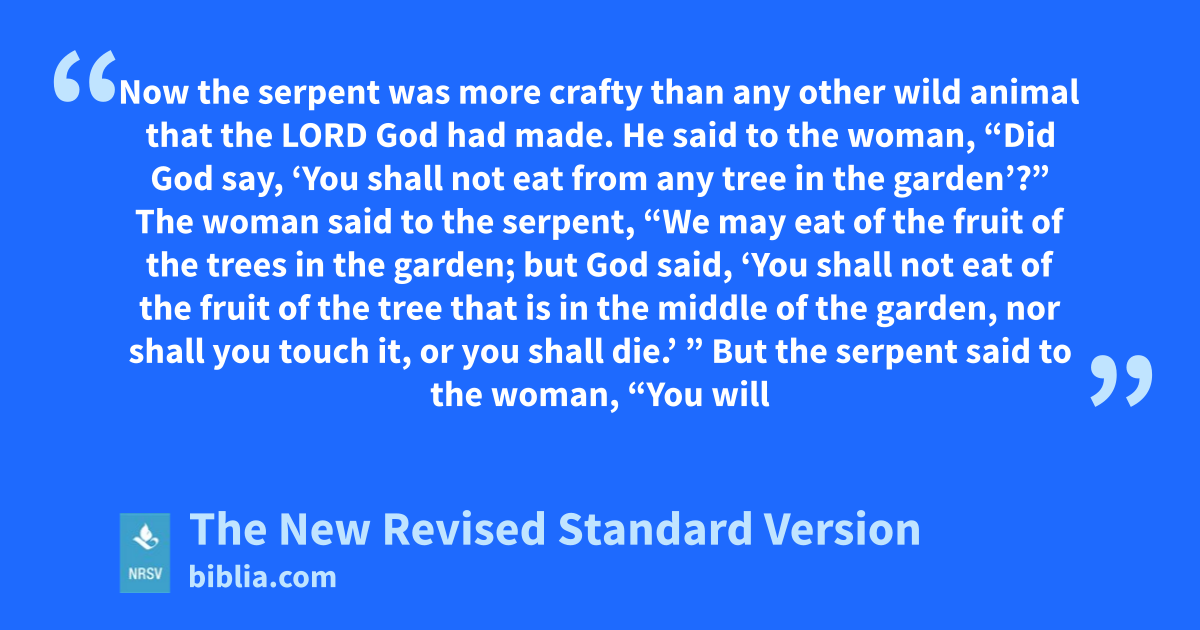 Now the serpent was more crafty than any other wild animal that the LORD God had made. He said to the woman, “Did God say, ‘You shall not eat from any tree in the garden’?” The woman said to the serpent, “We may eat of the fruit of the trees in the garden; but God said, ‘You shall not eat of the fruit of the tree that is in the middle of the garden, nor shall you touch it, or you shall die.’ ” But the serpent said to the woman, “You will
