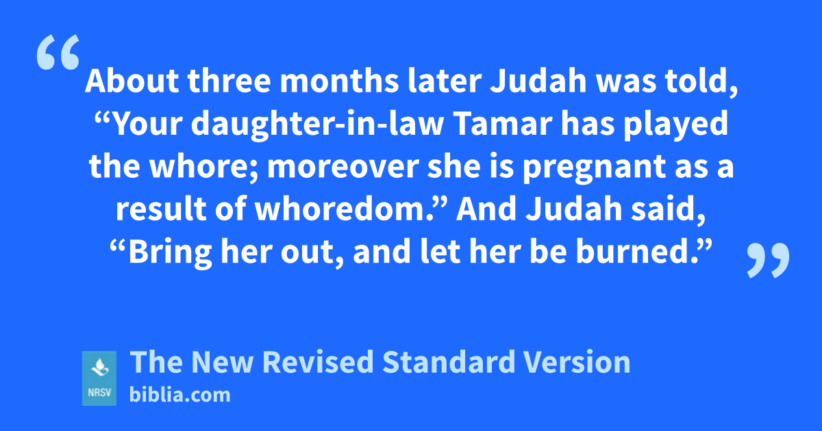 About three months later Judah was told, “Your daughter-in-law Tamar has played the whore; moreover she is pregnant as a result of whoredom.” And Judah said, “Bring her out, and let her be burned.”