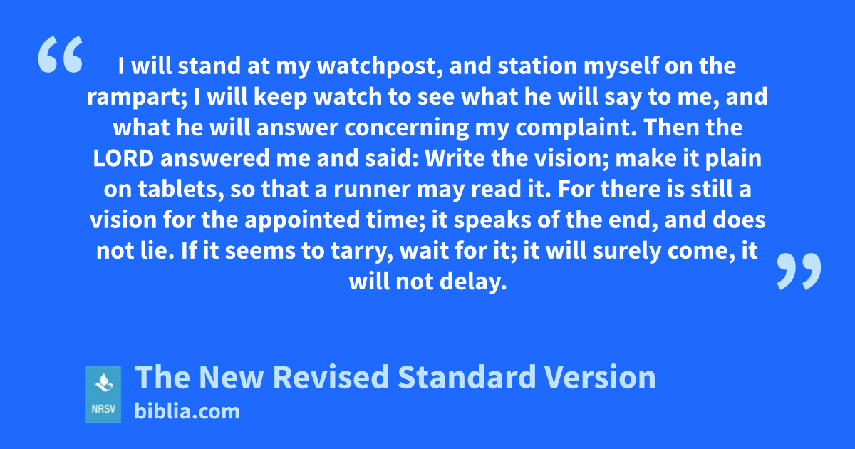 I will stand at my watchpost, and station myself on the rampart; I will keep watch to see what he will say to me, and what he will answer concerning my complaint. Then the LORD answered me and said: Write the vision; make it plain on tablets, so that a runner may read it. For there is still a vision for the appointed time; it speaks of the end, and does not lie. If it seems to tarry, wait for it; it will surely come, it will not delay.