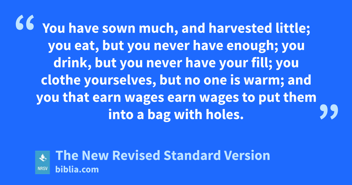 You have sown much, and harvested little; you eat, but you never have enough; you drink, but you never have your fill; you clothe yourselves, but no one is warm; and you that earn wages earn wages to put them into a bag with holes.