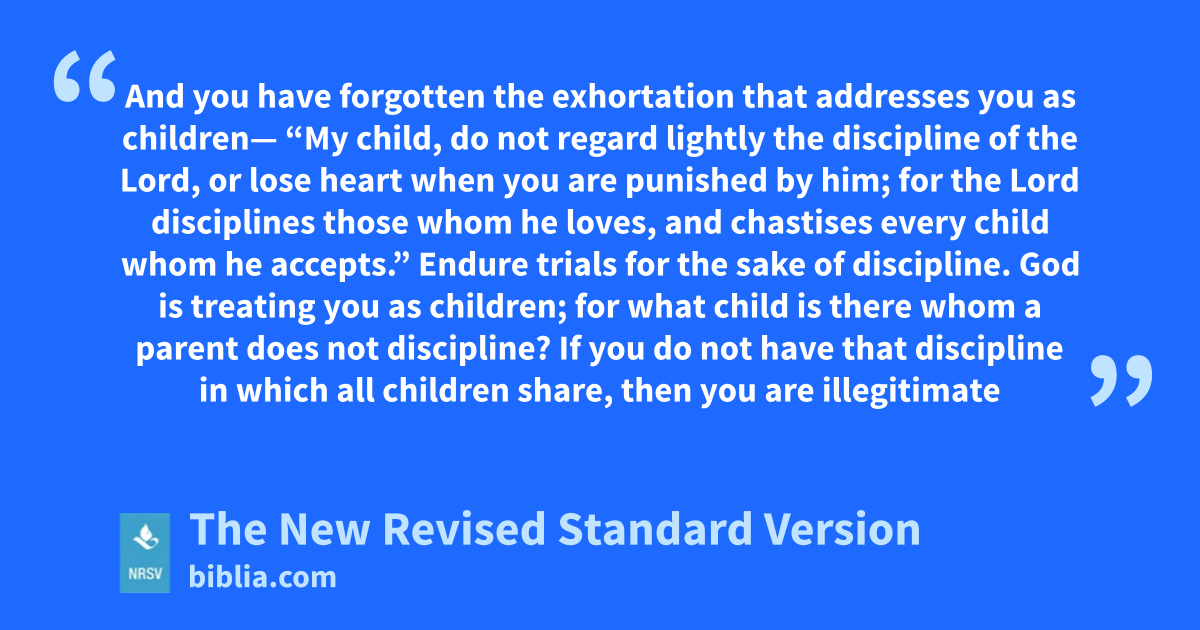 And you have forgotten the exhortation that addresses you as children— “My child, do not regard lightly the discipline of the Lord, or lose heart when you are punished by him; for the Lord disciplines those whom he loves, and chastises every child whom he accepts.” Endure trials for the sake of discipline. God is treating you as children; for what child is there whom a parent does not discipline? If you do not have that discipline in which all children share, then you are illegitimate