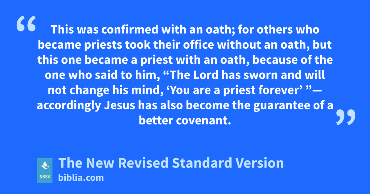 This was confirmed with an oath; for others who became priests took their office without an oath, but this one became a priest with an oath, because of the one who said to him, “The Lord has sworn and will not change his mind, ‘You are a priest forever’ ”— accordingly Jesus has also become the guarantee of a better covenant.