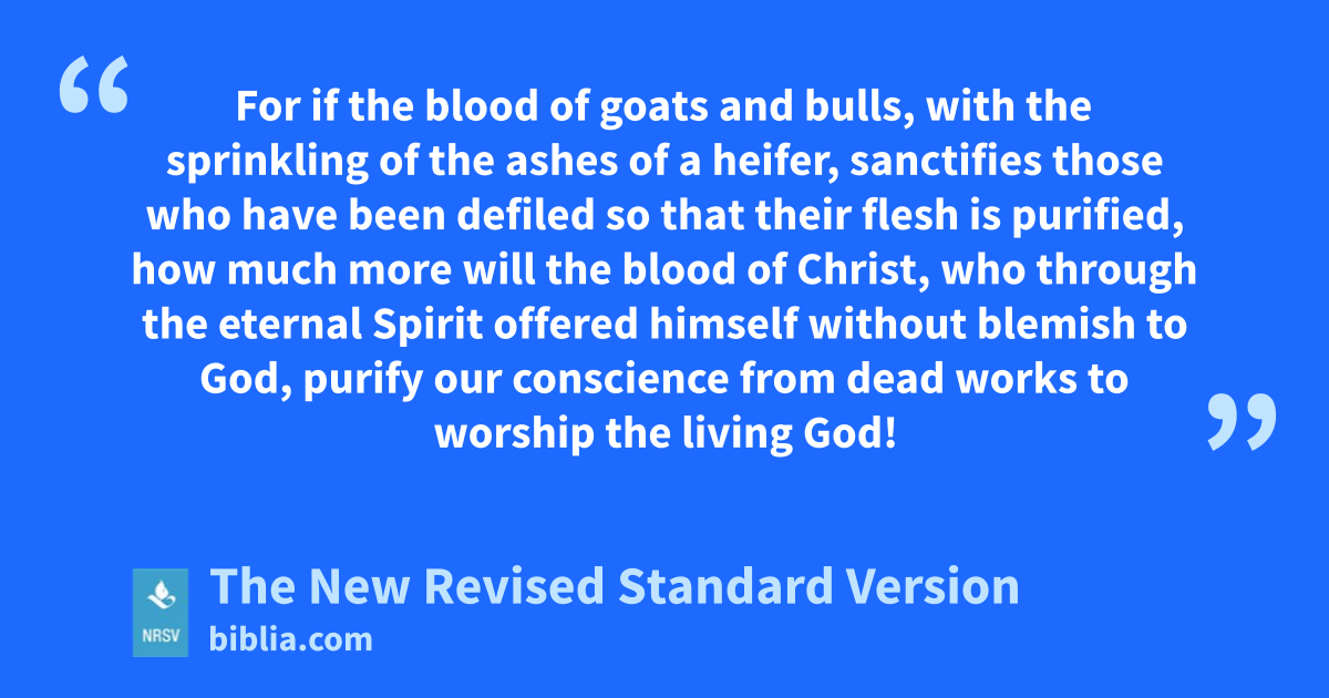For if the blood of goats and bulls, with the sprinkling of the ashes of a heifer, sanctifies those who have been defiled so that their flesh is purified, how much more will the blood of Christ, who through the eternal Spirit offered himself without blemish to God, purify our conscience from dead works to worship the living God!