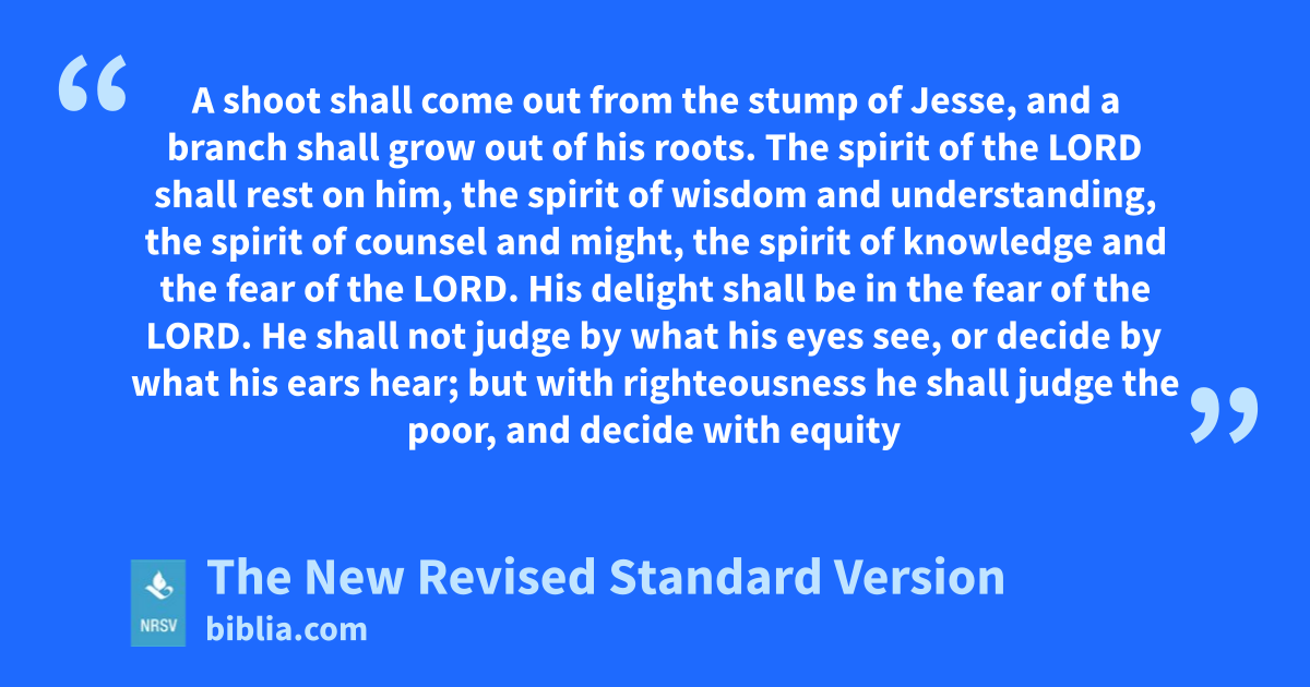 A shoot shall come out from the stump of Jesse, and a branch shall grow out of his roots. The spirit of the LORD shall rest on him, the spirit of wisdom and understanding, the spirit of counsel and might, the spirit of knowledge and the fear of the LORD. His delight shall be in the fear of the LORD. He shall not judge by what his eyes see, or decide by what his ears hear; but with righteousness he shall judge the poor, and decide with equity