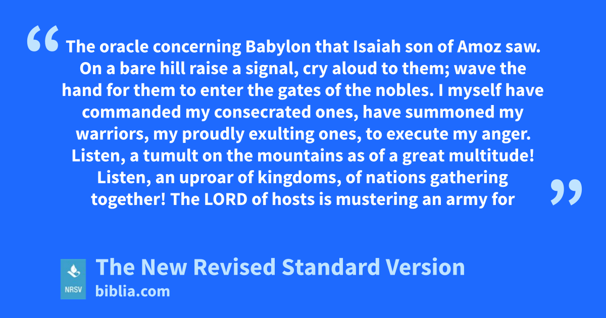 The oracle concerning Babylon that Isaiah son of Amoz saw. On a bare hill raise a signal, cry aloud to them; wave the hand for them to enter the gates of the nobles. I myself have commanded my consecrated ones, have summoned my warriors, my proudly exulting ones, to execute my anger. Listen, a tumult on the mountains as of a great multitude! Listen, an uproar of kingdoms, of nations gathering together! The LORD of hosts is mustering an army for