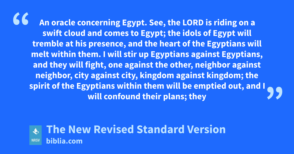An oracle concerning Egypt. See, the LORD is riding on a swift cloud and comes to Egypt; the idols of Egypt will tremble at his presence, and the heart of the Egyptians will melt within them. I will stir up Egyptians against Egyptians, and they will fight, one against the other, neighbor against neighbor, city against city, kingdom against kingdom; the spirit of the Egyptians within them will be emptied out, and I will confound their plans; they