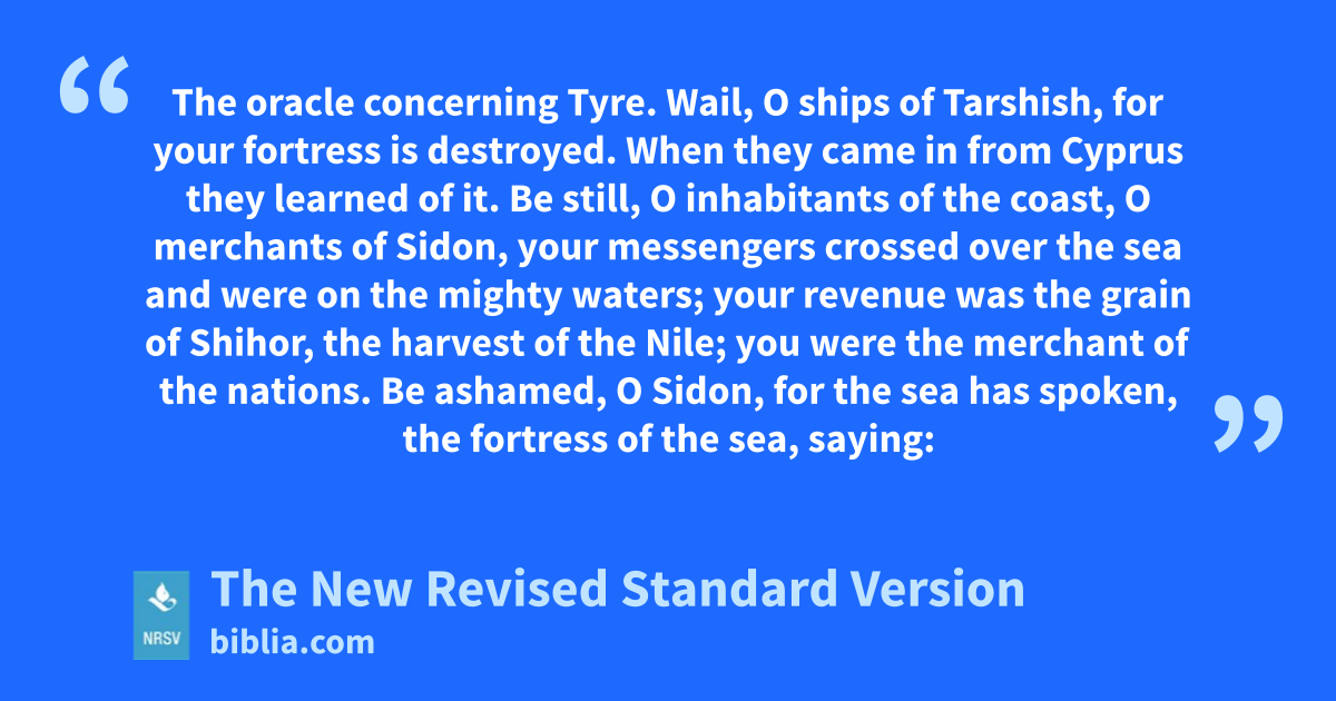 The oracle concerning Tyre. Wail, O ships of Tarshish, for your fortress is destroyed. When they came in from Cyprus they learned of it. Be still, O inhabitants of the coast, O merchants of Sidon, your messengers crossed over the sea and were on the mighty waters; your revenue was the grain of Shihor, the harvest of the Nile; you were the merchant of the nations. Be ashamed, O Sidon, for the sea has spoken, the fortress of the sea, saying:
