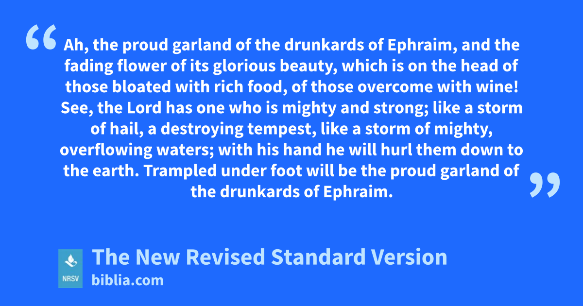 Ah, the proud garland of the drunkards of Ephraim, and the fading flower of its glorious beauty, which is on the head of those bloated with rich food, of those overcome with wine! See, the Lord has one who is mighty and strong; like a storm of hail, a destroying tempest, like a storm of mighty, overflowing waters; with his hand he will hurl them down to the earth. Trampled under foot will be the proud garland of the drunkards of Ephraim.