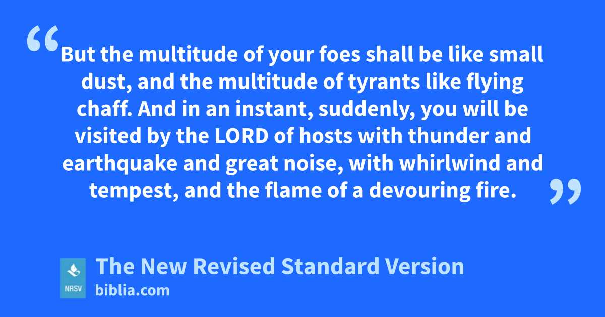But the multitude of your foes shall be like small dust, and the multitude of tyrants like flying chaff. And in an instant, suddenly, you will be visited by the LORD of hosts with thunder and earthquake and great noise, with whirlwind and tempest, and the flame of a devouring fire.