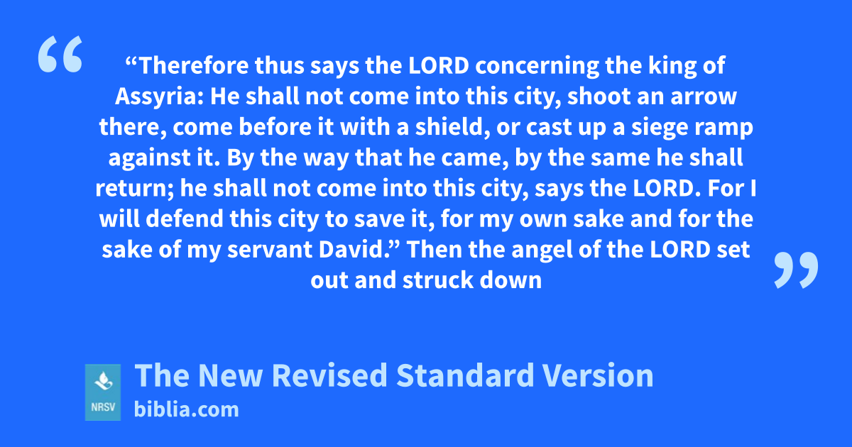 “Therefore thus says the LORD concerning the king of Assyria: He shall not come into this city, shoot an arrow there, come before it with a shield, or cast up a siege ramp against it. By the way that he came, by the same he shall return; he shall not come into this city, says the LORD. For I will defend this city to save it, for my own sake and for the sake of my servant David.” Then the angel of the LORD set out and struck down