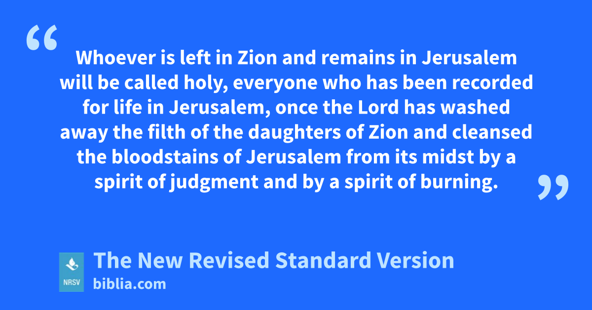 Whoever is left in Zion and remains in Jerusalem will be called holy, everyone who has been recorded for life in Jerusalem, once the Lord has washed away the filth of the daughters of Zion and cleansed the bloodstains of Jerusalem from its midst by a spirit of judgment and by a spirit of burning.