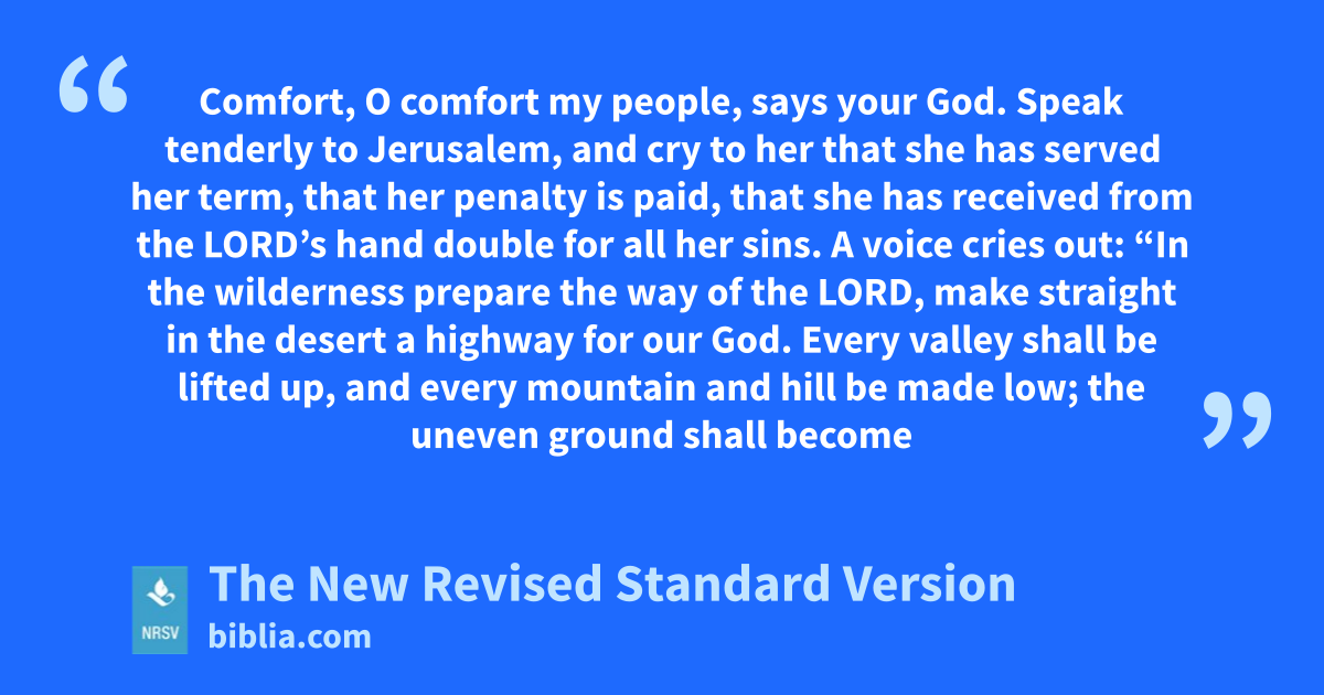 Comfort, O comfort my people, says your God. Speak tenderly to Jerusalem, and cry to her that she has served her term, that her penalty is paid, that she has received from the LORD’s hand double for all her sins. A voice cries out: “In the wilderness prepare the way of the LORD, make straight in the desert a highway for our God. Every valley shall be lifted up, and every mountain and hill be made low; the uneven ground shall become