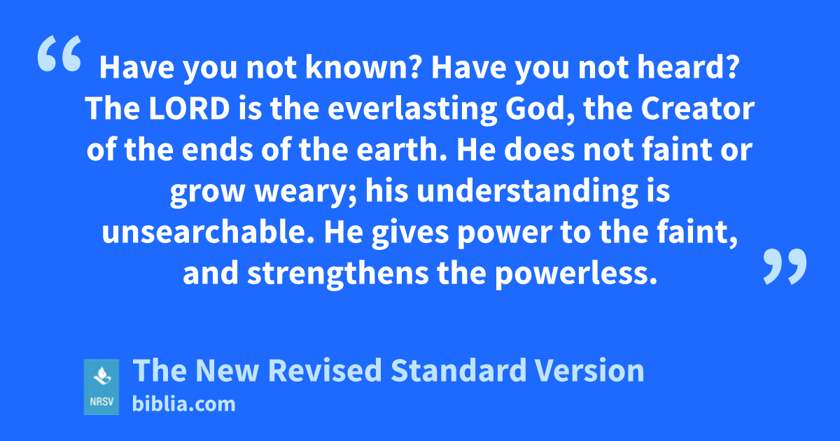 Have you not known? Have you not heard? The LORD is the everlasting God, the Creator of the ends of the earth. He does not faint or grow weary; his understanding is unsearchable. He gives power to the faint, and strengthens the powerless.