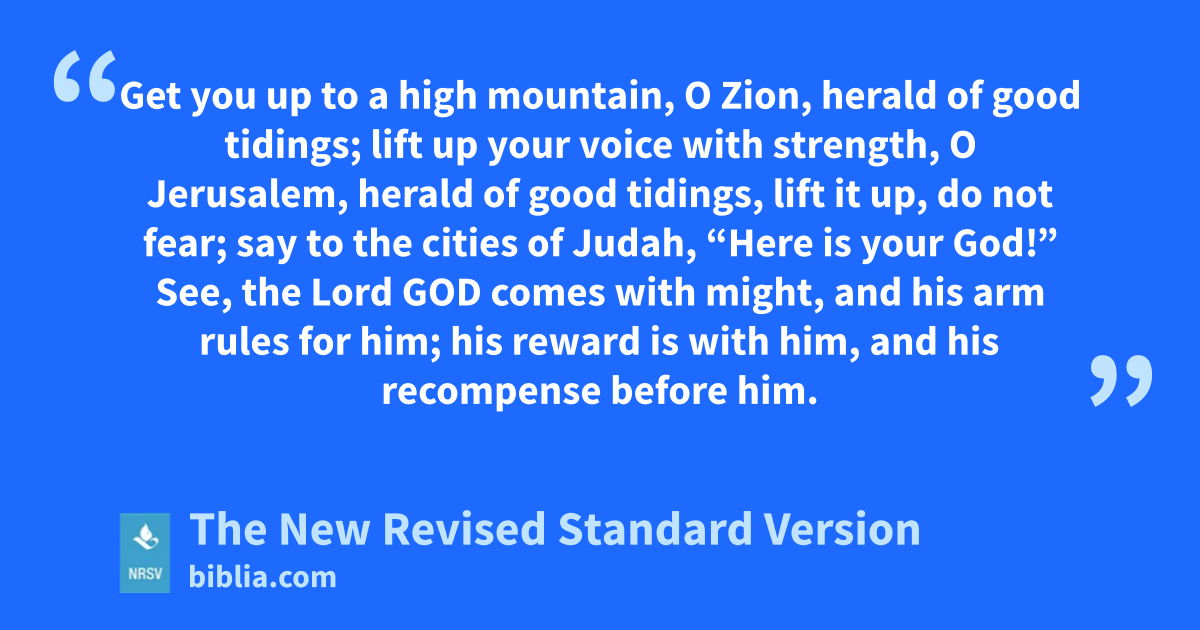 Get you up to a high mountain, O Zion, herald of good tidings; lift up your voice with strength, O Jerusalem, herald of good tidings, lift it up, do not fear; say to the cities of Judah, “Here is your God!” See, the Lord GOD comes with might, and his arm rules for him; his reward is with him, and his recompense before him.