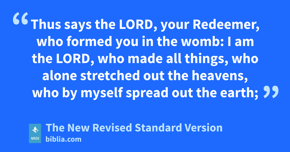 Thus says the LORD, your Redeemer, who formed you in the womb: I am the LORD, who made all things, who alone stretched out the heavens, who by myself spread out the earth;