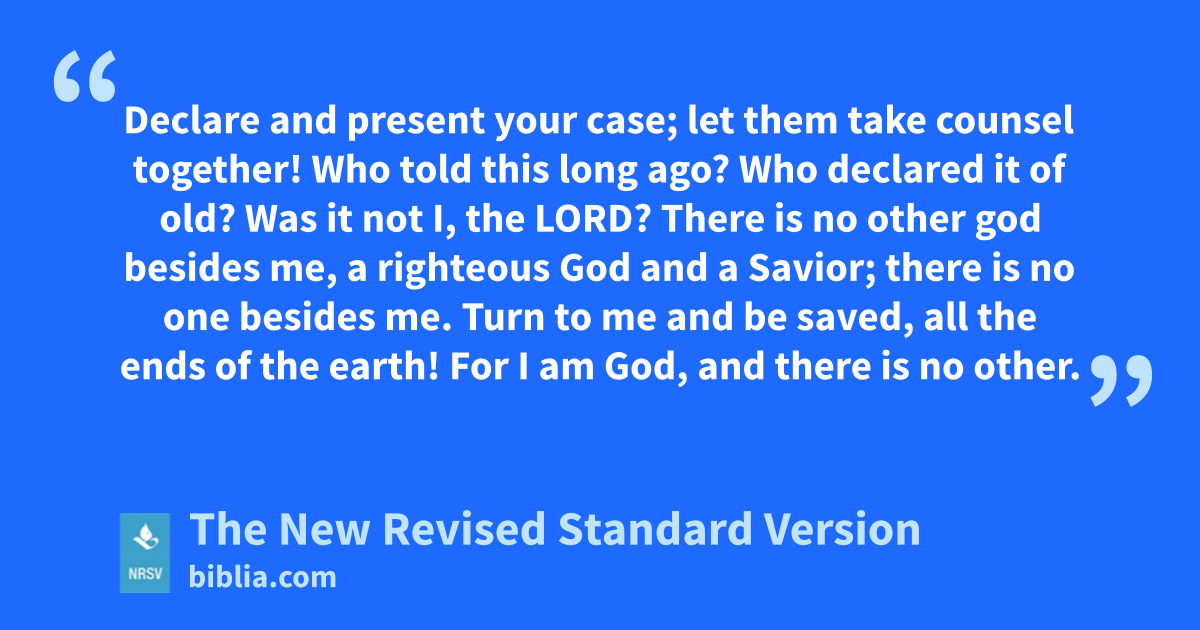 Declare and present your case; let them take counsel together! Who told this long ago? Who declared it of old? Was it not I, the LORD? There is no other god besides me, a righteous God and a Savior; there is no one besides me. Turn to me and be saved, all the ends of the earth! For I am God, and there is no other.
