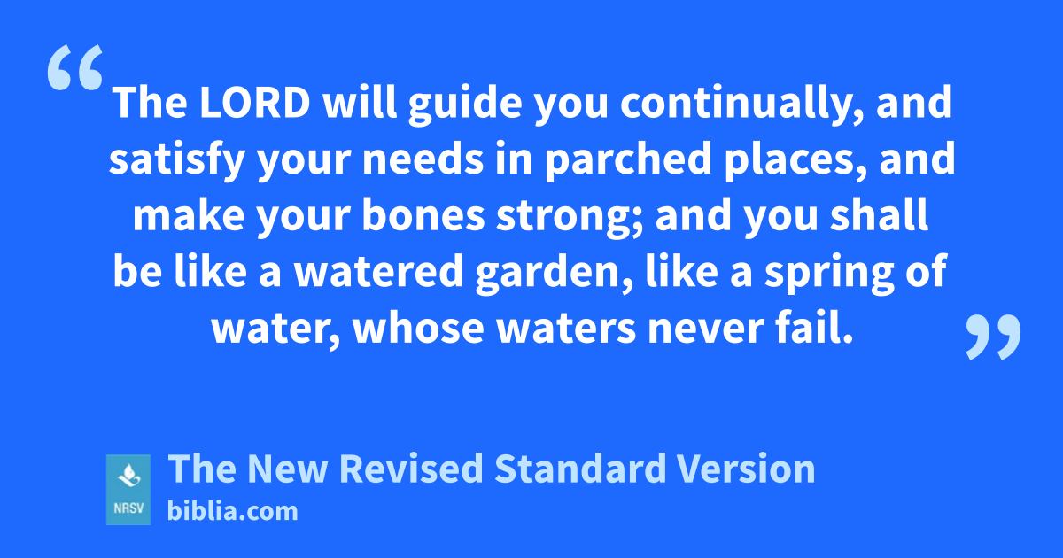The LORD will guide you continually, and satisfy your needs in parched places, and make your bones strong; and you shall be like a watered garden, like a spring of water, whose waters never fail.