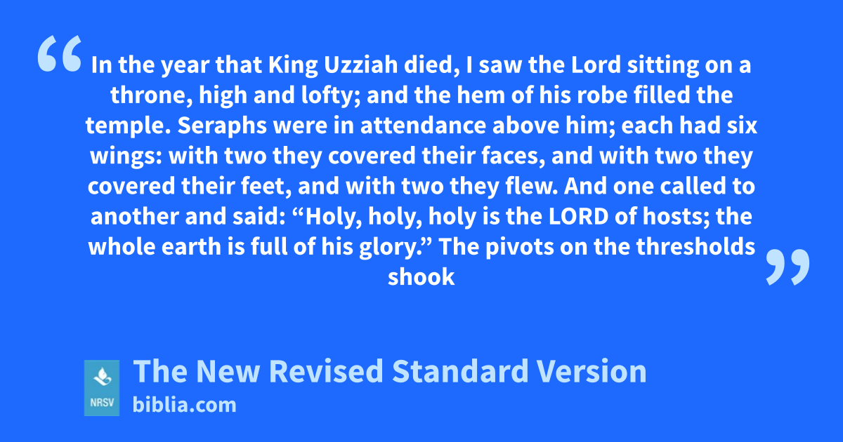 In the year that King Uzziah died, I saw the Lord sitting on a throne, high and lofty; and the hem of his robe filled the temple. Seraphs were in attendance above him; each had six wings: with two they covered their faces, and with two they covered their feet, and with two they flew. And one called to another and said: “Holy, holy, holy is the LORD of hosts; the whole earth is full of his glory.” The pivots on the thresholds shook