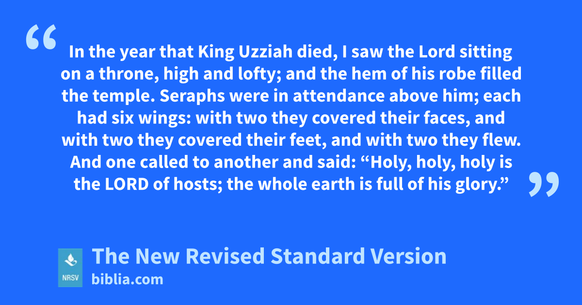 In the year that King Uzziah died, I saw the Lord sitting on a throne, high and lofty; and the hem of his robe filled the temple. Seraphs were in attendance above him; each had six wings: with two they covered their faces, and with two they covered their feet, and with two they flew. And one called to another and said: “Holy, holy, holy is the LORD of hosts; the whole earth is full of his glory.”
