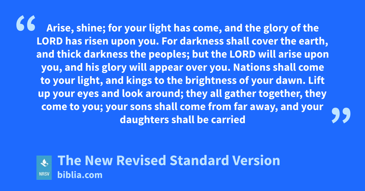 Arise, shine; for your light has come, and the glory of the LORD has risen upon you. For darkness shall cover the earth, and thick darkness the peoples; but the LORD will arise upon you, and his glory will appear over you. Nations shall come to your light, and kings to the brightness of your dawn. Lift up your eyes and look around; they all gather together, they come to you; your sons shall come from far away, and your daughters shall be carried