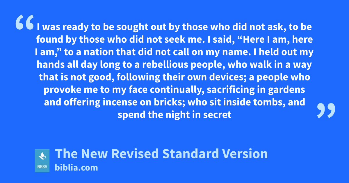 I was ready to be sought out by those who did not ask, to be found by those who did not seek me. I said, “Here I am, here I am,” to a nation that did not call on my name. I held out my hands all day long to a rebellious people, who walk in a way that is not good, following their own devices; a people who provoke me to my face continually, sacrificing in gardens and offering incense on bricks; who sit inside tombs, and spend the night in secret