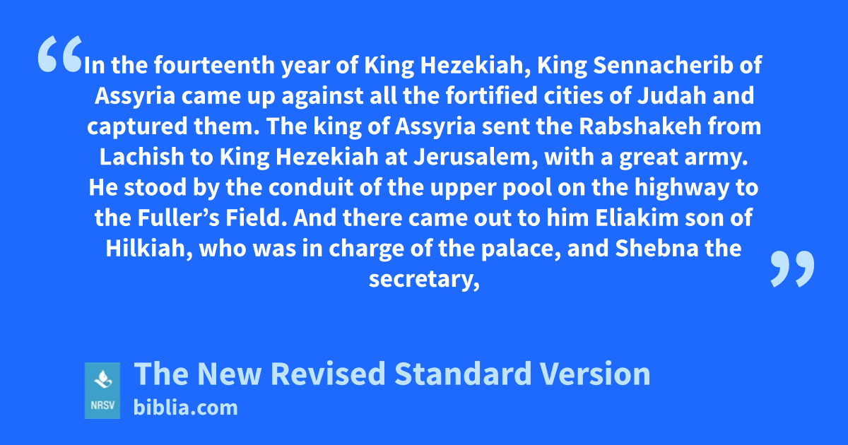 In the fourteenth year of King Hezekiah, King Sennacherib of Assyria came up against all the fortified cities of Judah and captured them. The king of Assyria sent the Rabshakeh from Lachish to King Hezekiah at Jerusalem, with a great army. He stood by the conduit of the upper pool on the highway to the Fuller’s Field. And there came out to him Eliakim son of Hilkiah, who was in charge of the palace, and Shebna the secretary,