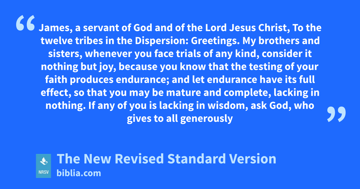 James, a servant of God and of the Lord Jesus Christ, To the twelve tribes in the Dispersion: Greetings. My brothers and sisters, whenever you face trials of any kind, consider it nothing but joy, because you know that the testing of your faith produces endurance; and let endurance have its full effect, so that you may be mature and complete, lacking in nothing. If any of you is lacking in wisdom, ask God, who gives to all generously