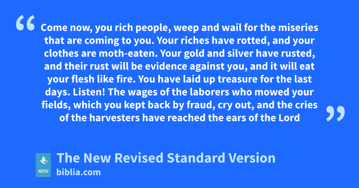 Come now, you rich people, weep and wail for the miseries that are coming to you. Your riches have rotted, and your clothes are moth-eaten. Your gold and silver have rusted, and their rust will be evidence against you, and it will eat your flesh like fire. You have laid up treasure for the last days. Listen! The wages of the laborers who mowed your fields, which you kept back by fraud, cry out, and the cries of the harvesters have reached the ears of the Lord